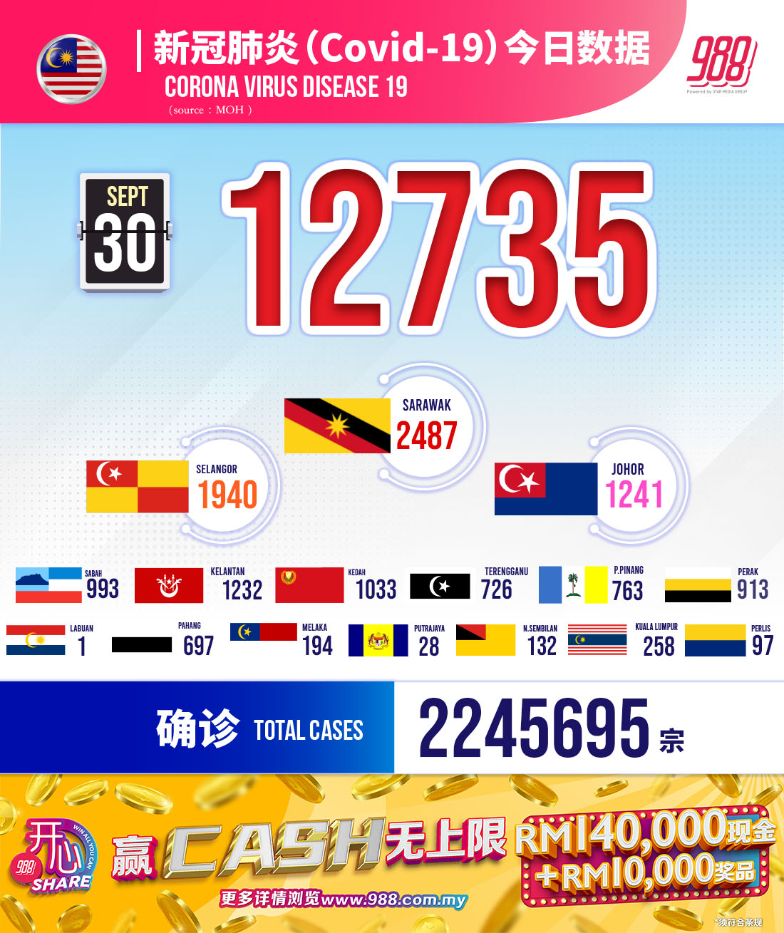 卫生部通报,截至30日12pm,我国新增 #12,735例,累计病例至今 # 2,245,695 宗。