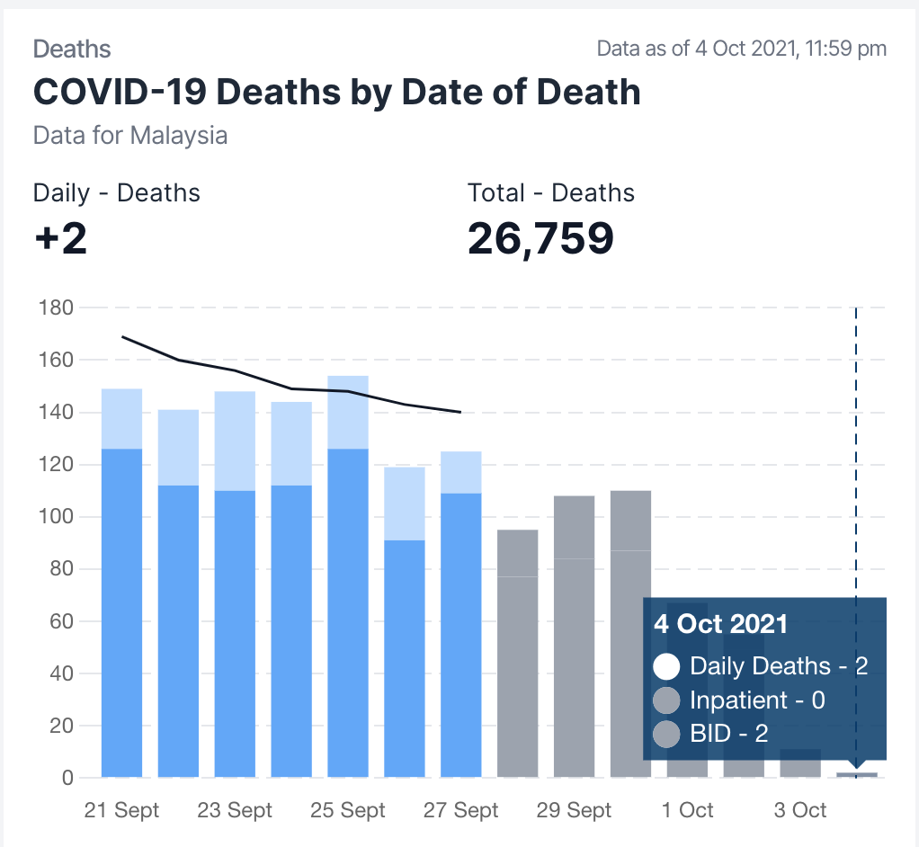 卫生部COVIDNOW网站深夜11时59分通报,10月4日新增死亡病例(包括积压病例)大幅下跌,报76宗,累计达26,759宗。