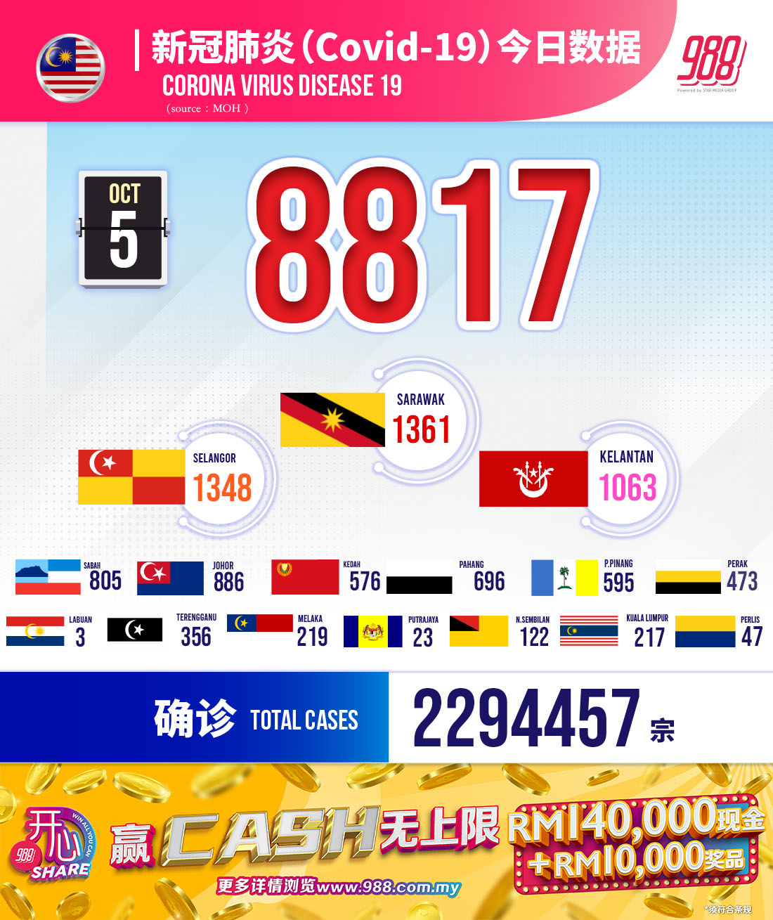 卫生部通报,截至5日12pm,我国新增 #8,817例,累计病例至今 # 2,294,457 宗。