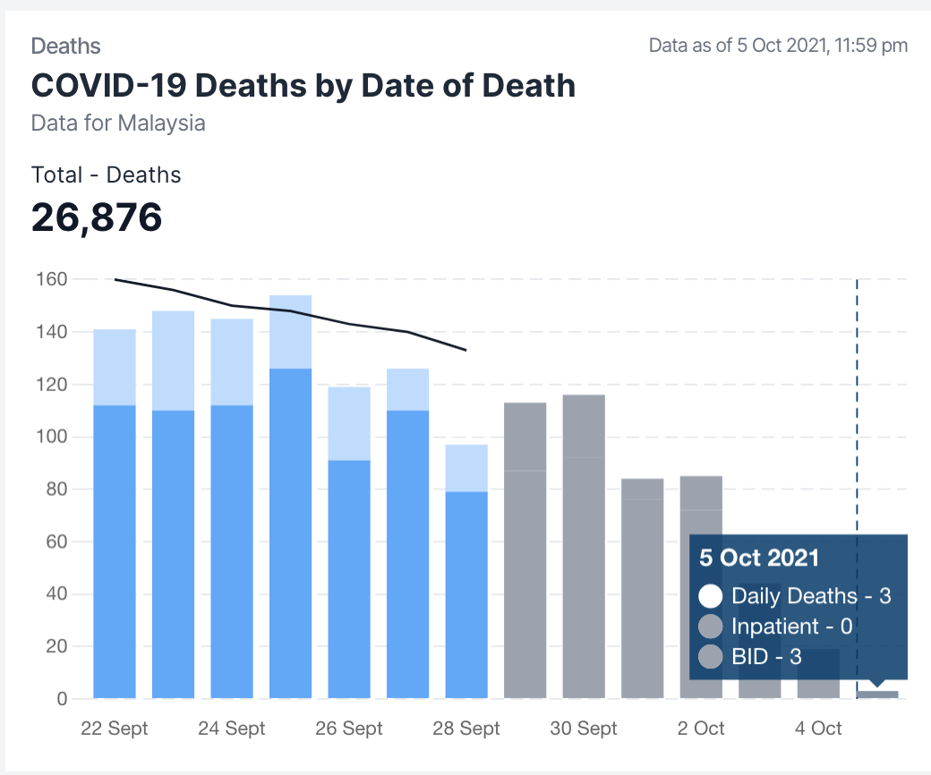 卫生部COVIDNOW网站深夜11时59分通报,10月5日新增死亡病例(包括积压病例)再度回扬,报117宗,累计达26,876宗。