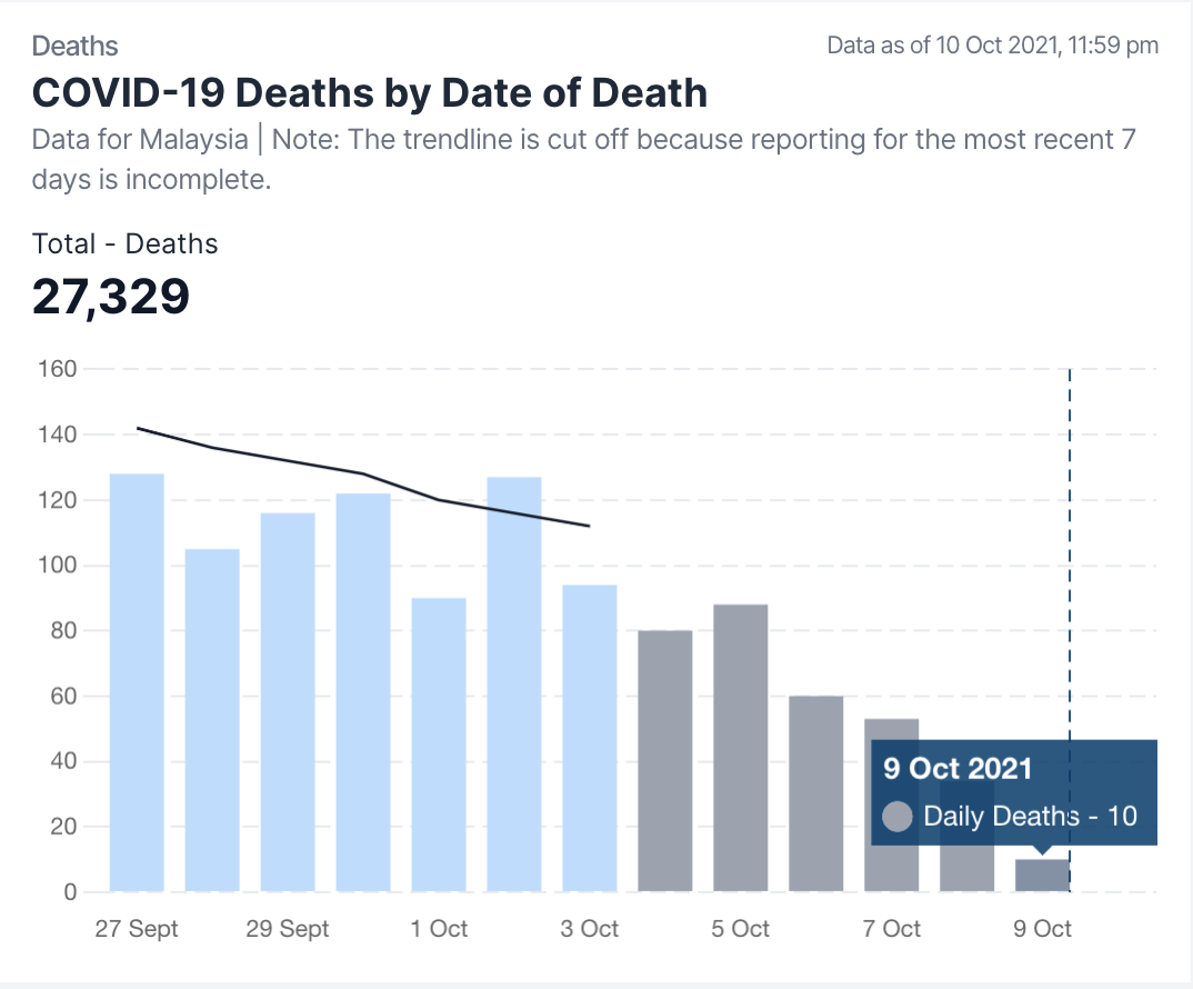 卫生部COVIDNOW网站深夜11时59分通报,10月10日新增死亡病例(包括积压病例)继续下降,报64死,累计达27,329宗。