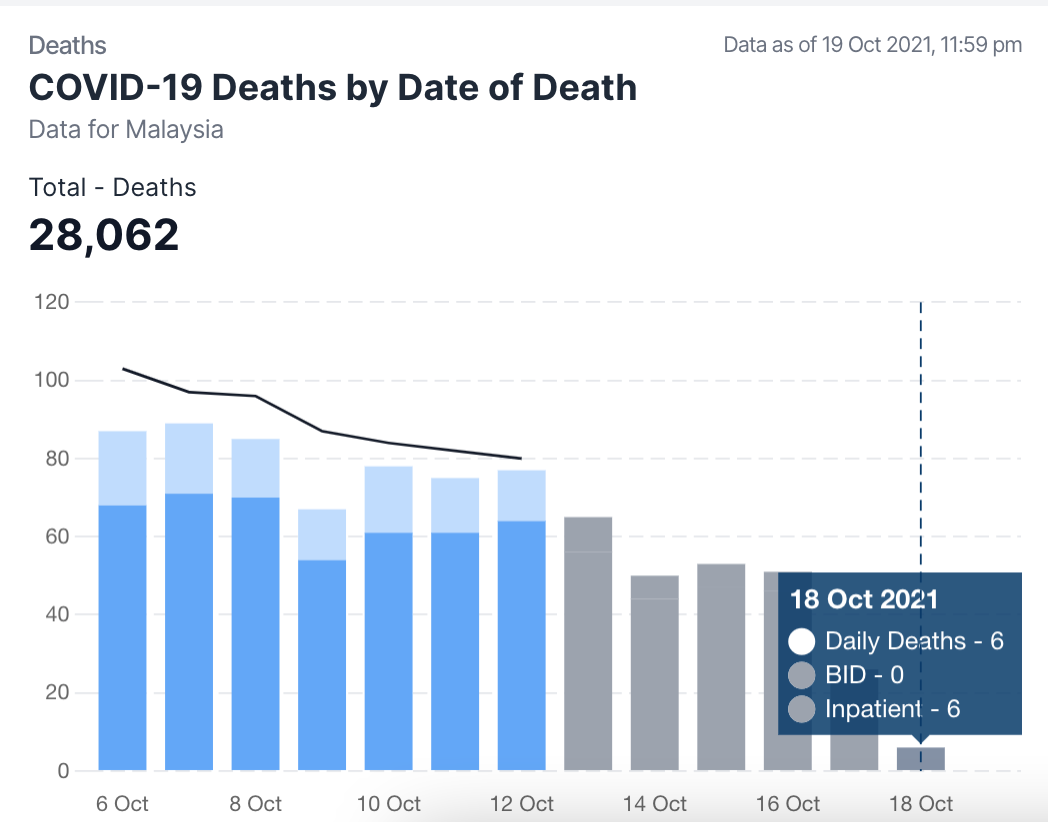 卫生部COVIDNOW网站深夜11时59分通报,10月19日新增死亡病例(包括积压病例)继续往下,报69死,累计达28,062宗。