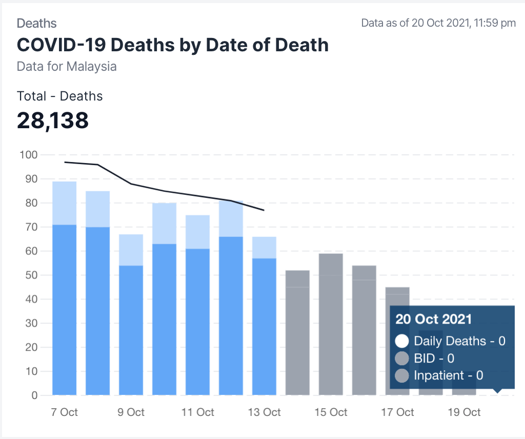 卫生部COVIDNOW网站深夜11时59分通报,10月20日新增死亡病例(包括积压病例)又回升,报76死,累计达28,138宗。