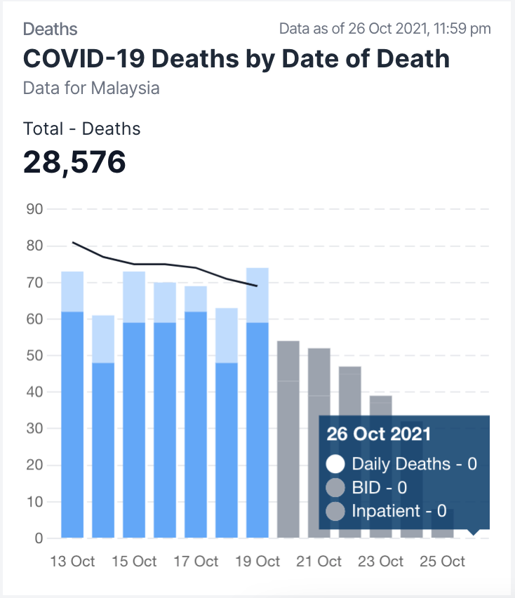 卫生部COVIDNOW网站深夜11时59分通报,10月26日新增死亡病例(包括积压病例)稍下降,报84死,累计达28,576宗。