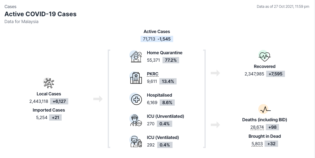 卫生部COVIDNOW网站深夜11时59分通报,10月27日新增死亡病例(包括积压病例)稍下降,报98死,累计达28,674宗。