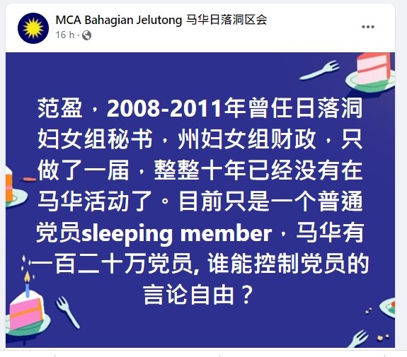此外,马华日落洞区会也在脸书贴文,指范盈确实是党员,但已有10年不活跃,目前就是一位普通党员,而马华有120万党员,谁能控制党员的言论自由?