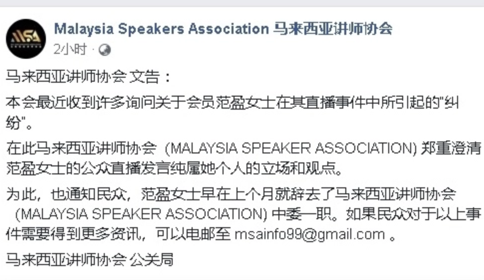 《星洲日报》报道,马来西亚讲师协会发表声明,指会员范盈的公众直播发言,纯属后者的个人的立场和观点。