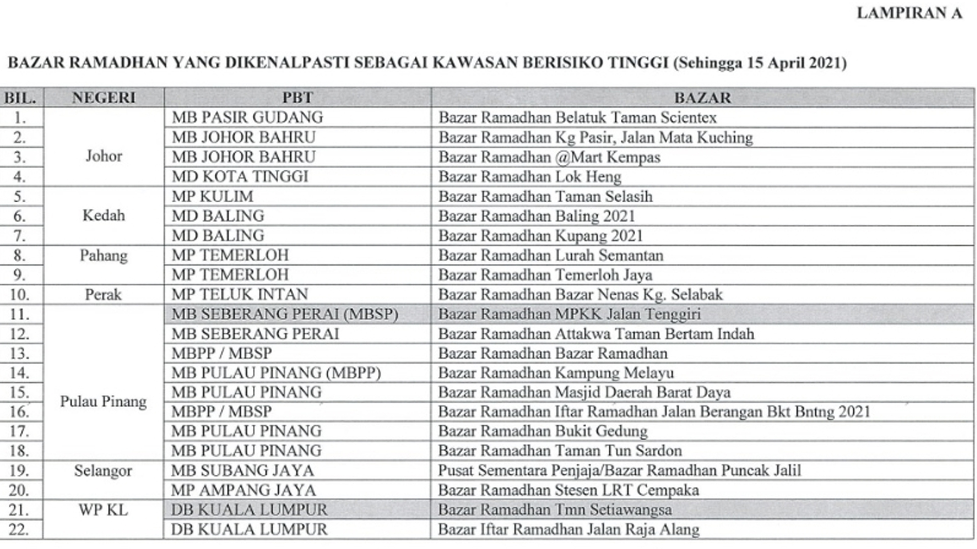 房地部秘书长再纳阿比丁发函指出,卫生部通过MySejahtera应用程序追踪密切接触者的分析结果显示,这些地区的斋戒月市集存在疫情传播威胁。