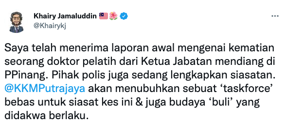 他今日在推特撰文表示,本身已接获槟城中央医院院长的初步调查报告。