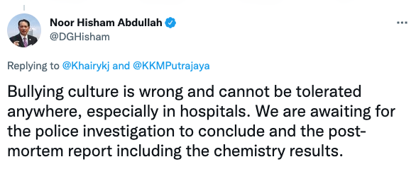 卫生总监诺希山今午也在推特撰文说,不管在任何地方尤其医院,都不能容忍霸凌事件。