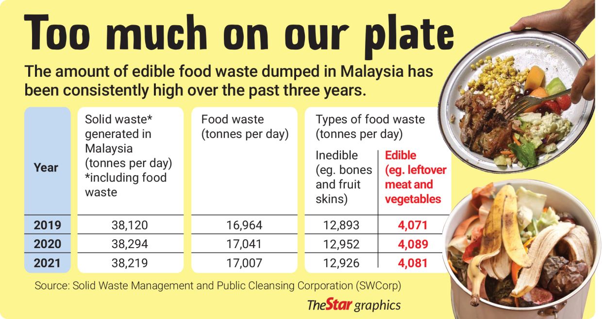 SWCorp此前所发表的数据指,大马人每天产生的食物垃圾可填满7个奥林匹克规模泳池,这代表每天的3万8000吨生活垃圾中,有45%(即1万7000吨)为食物垃圾,其中约4080吨仍可食用,以上食物资源,足以提供300万人的每日三餐。