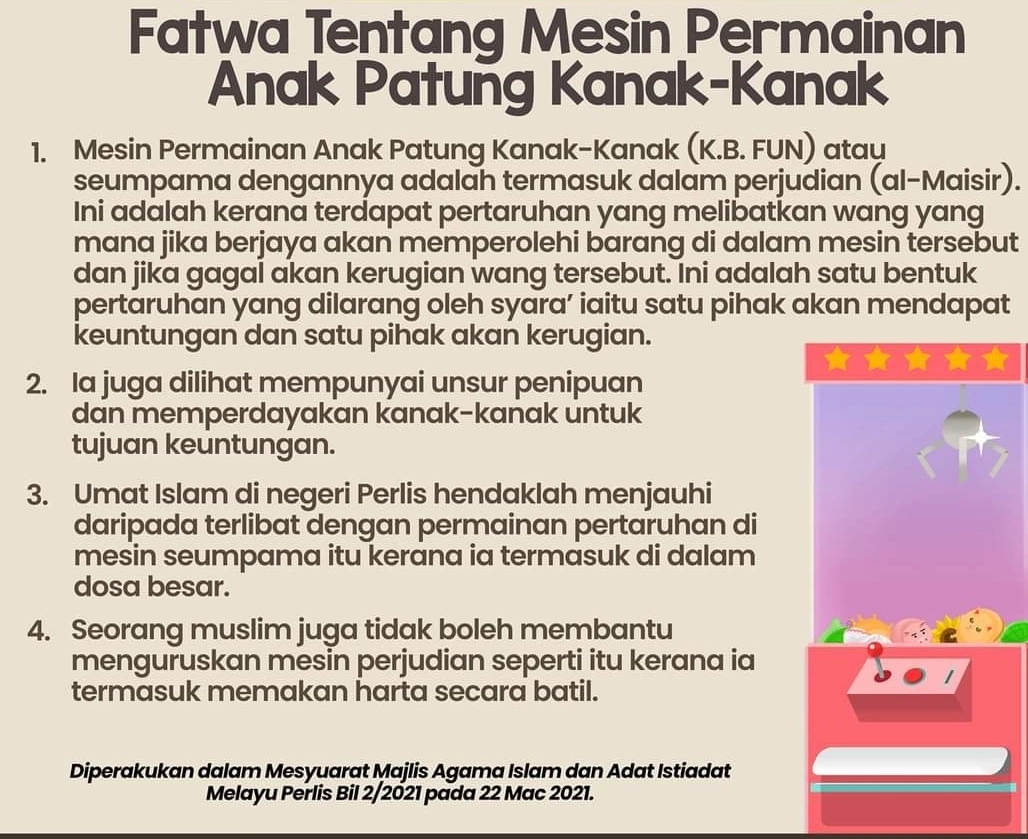 这项裁决于今年3月22日,在玻璃市宗教及马来风俗理事会会议上通过。裁决也认为,夹娃娃机存有欺骗及诱惑儿童的意图以便赚取利润。