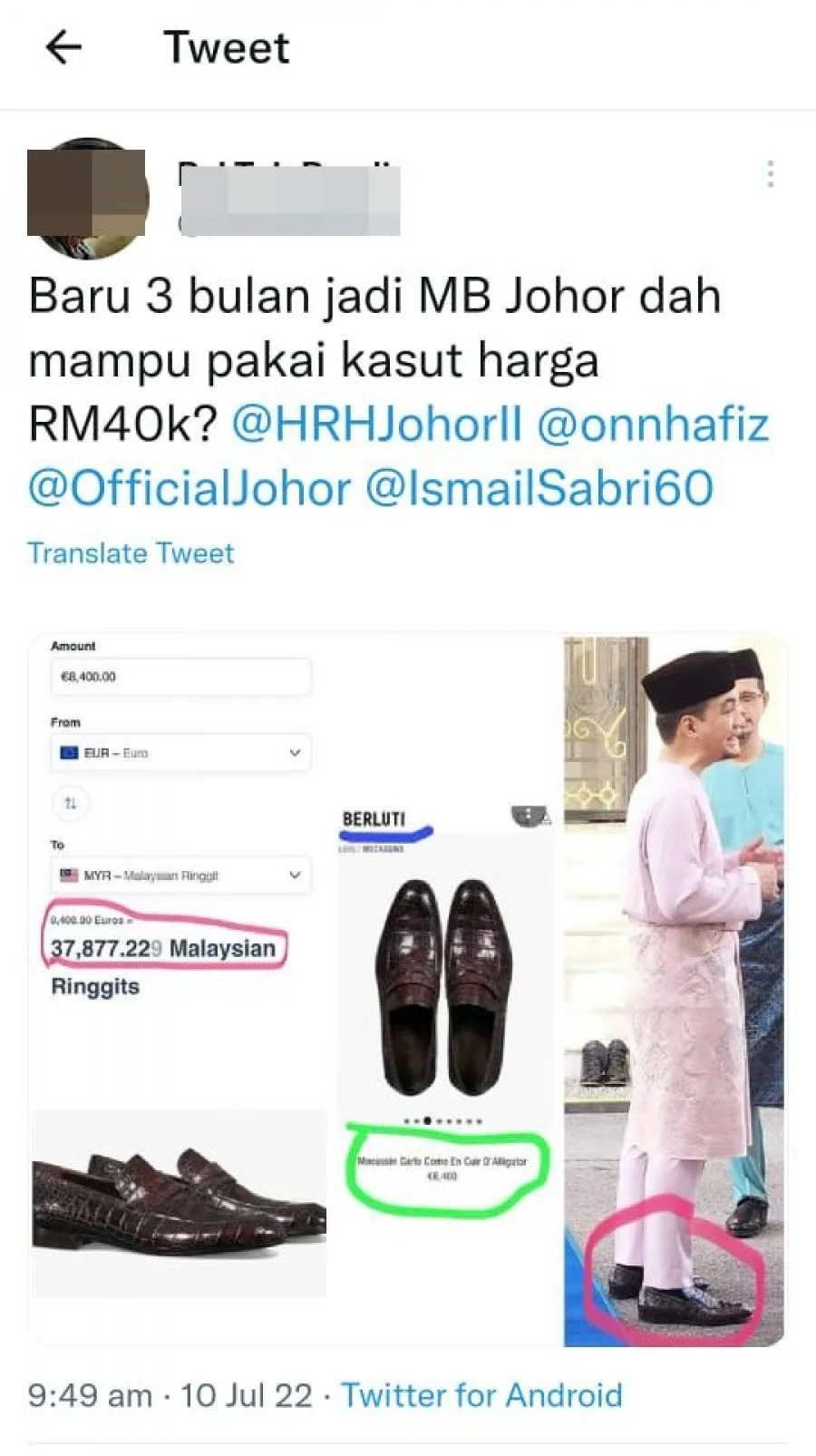 在昨天网络上,有一网民在推特上载推文,指翁哈菲兹出席活动疑似穿了一双价值近4万令吉的法国Berluti高级鳄鱼皮皮鞋,并撰文:“才当大臣3个月,就能穿整4万令吉的鞋?”
