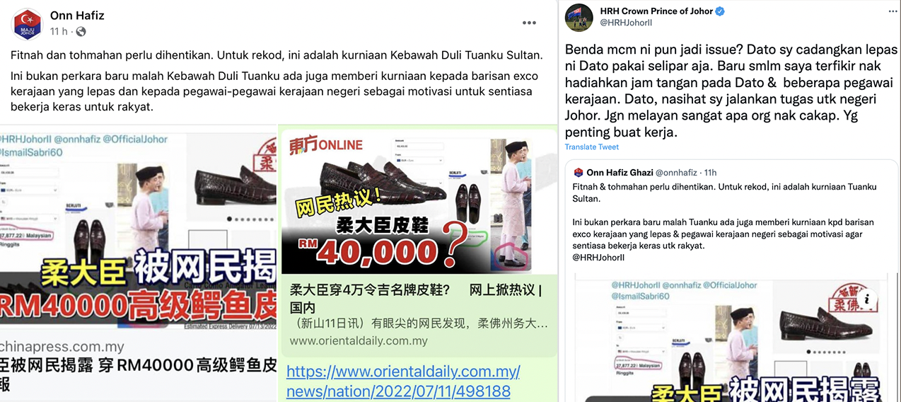柔佛大臣翁哈菲兹哈兹出席活动,被眼尖的网民发现及质疑脚穿超奢华法国Berluti高级鳄鱼皮鞋,引发网友议论,舆论发酵后大臣亲上火线回应“鞋乃柔苏丹陛下所赠”,而柔摄政王也出言护航:“那下次穿拖鞋好了!”