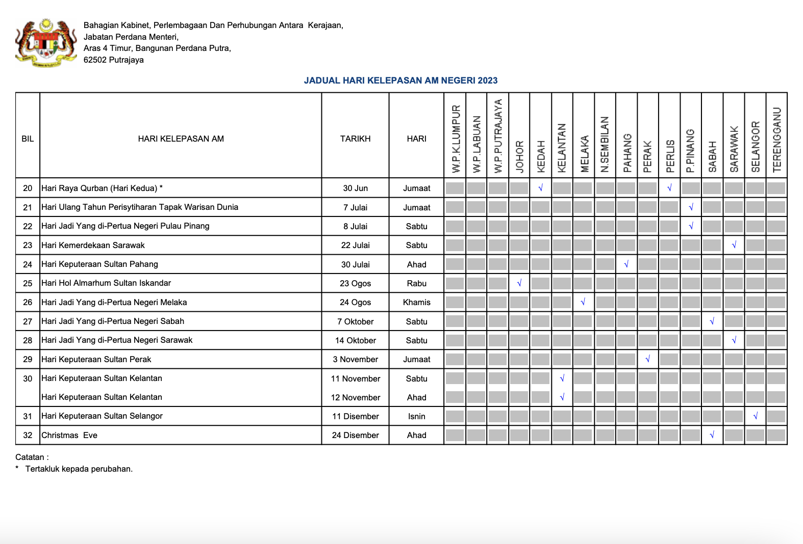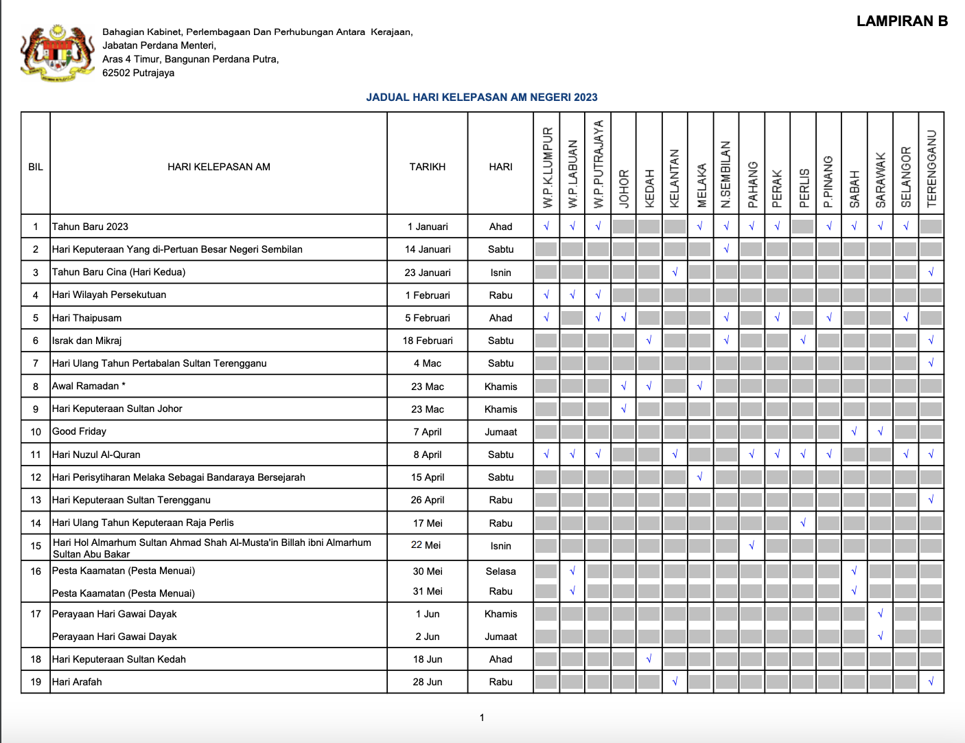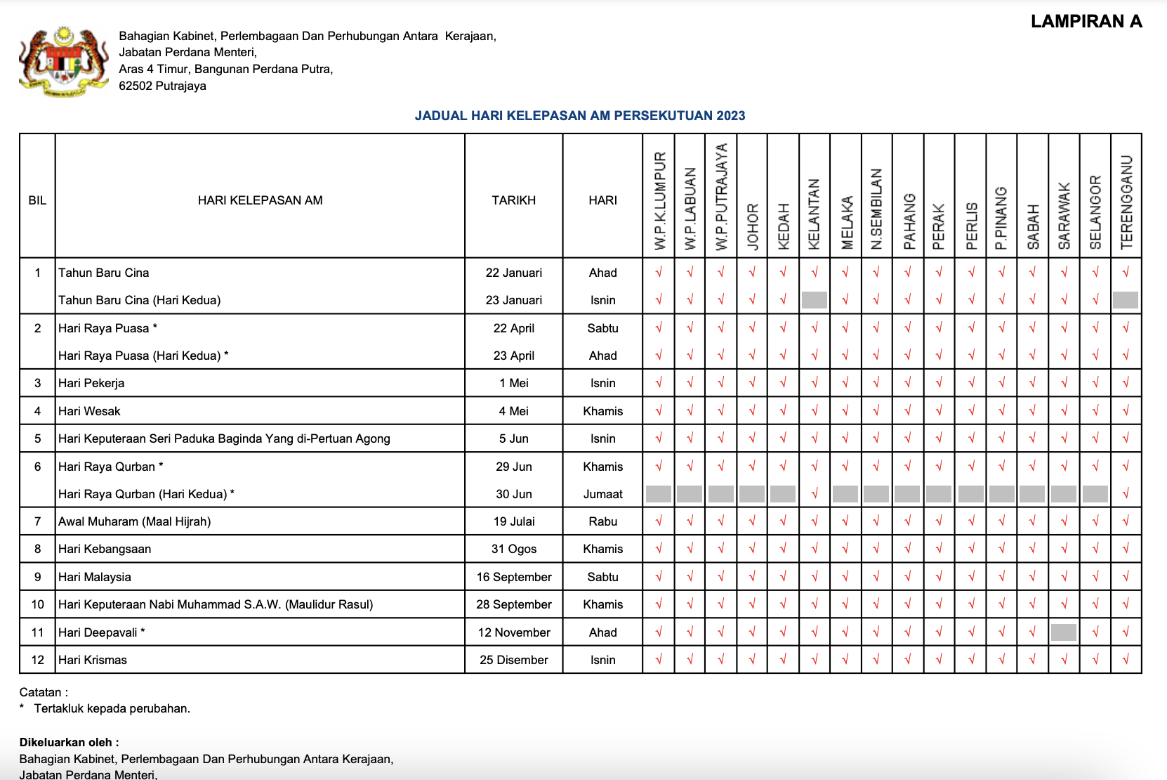 政府公布我国2023年全国公共假期表,除各州属及直辖区假期外,大部分州属明年可享14天全国公假!