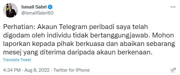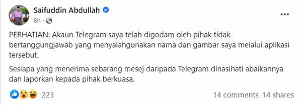 此外,首相沙比里昨日也在自己的社媒专页通报其Telegram账户被骇。