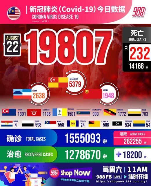 卫生部通报,截至21日12pm,我国新增19,807例,累计病例至今 #1,555,093宗,新增232死累计#14,168死