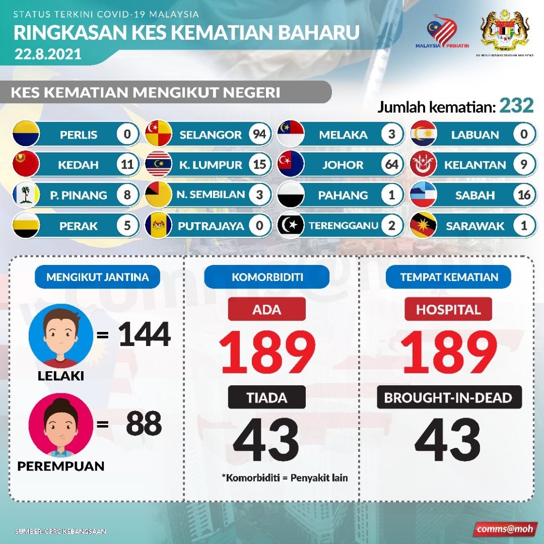 📌今天有232人死,分别来自雪州(94)、柔佛(64)、沙巴(16)、吉隆坡(15)、吉打(11)、吉兰丹(9)、槟城(8)、霹雳(5)、马六甲和森美兰各3人、登嘉楼(2)、砂拉越和彭亨各1人