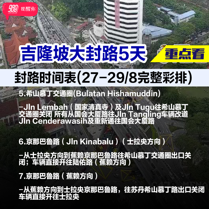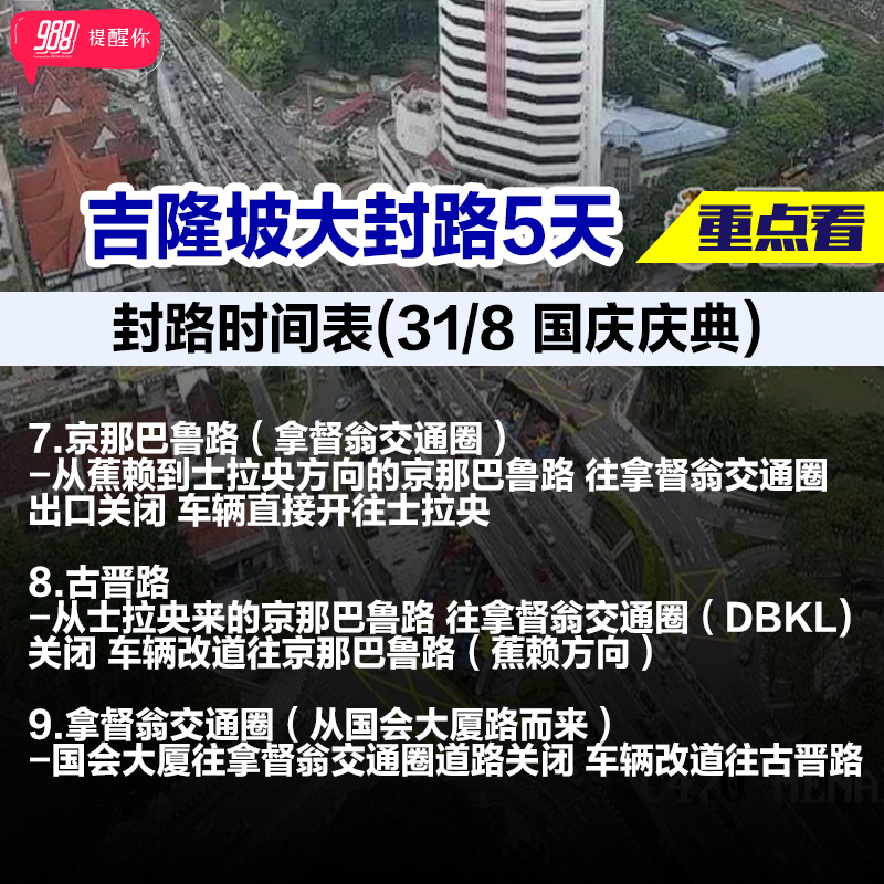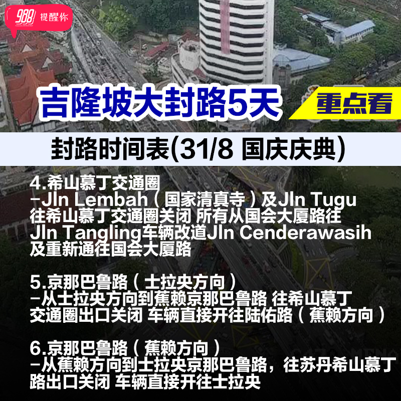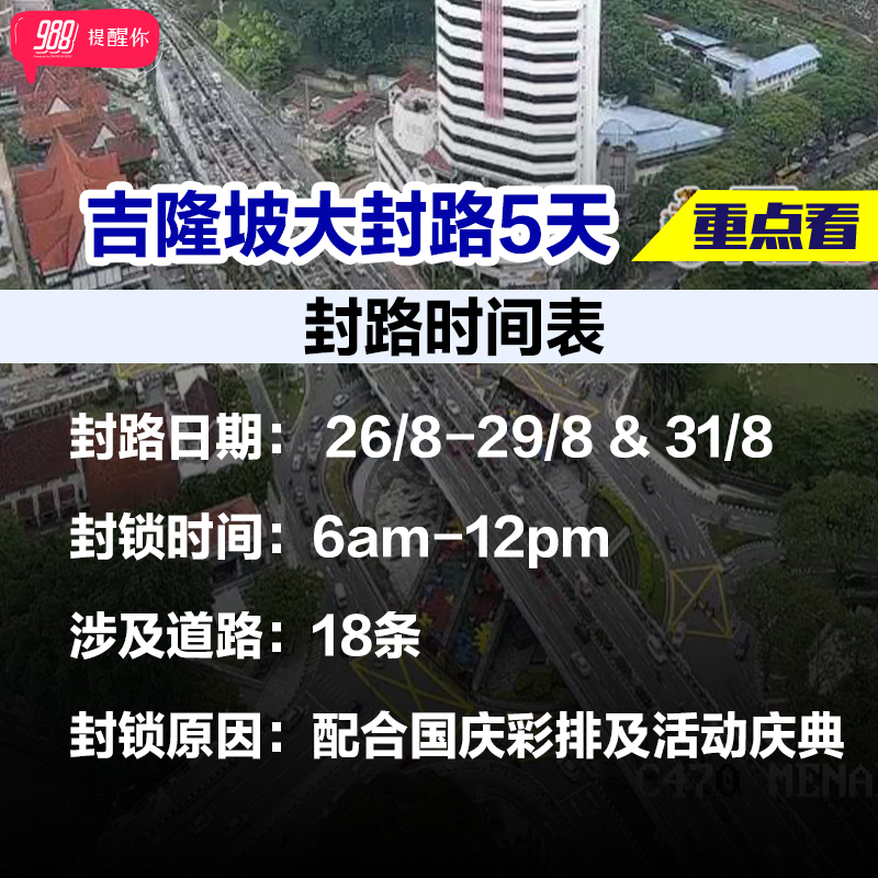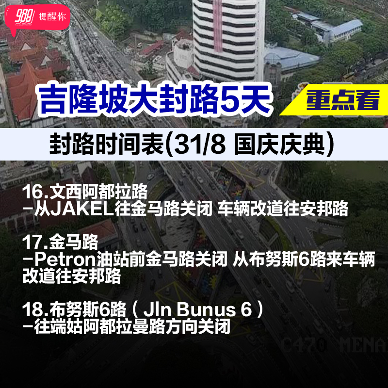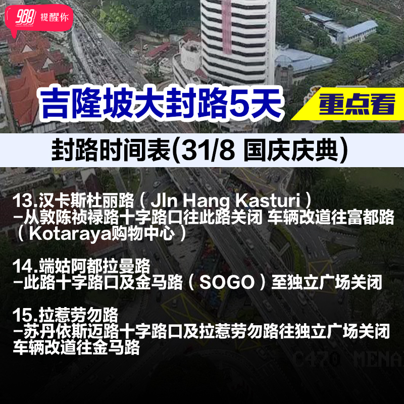 吉隆坡总警长拿督阿兹米发文告说,封路措施将会在特定日期及时间进行,即从8月26日至29日以进行彩排,以及国庆日当天,封路时间从早上6时开始至凌晨12时结束。