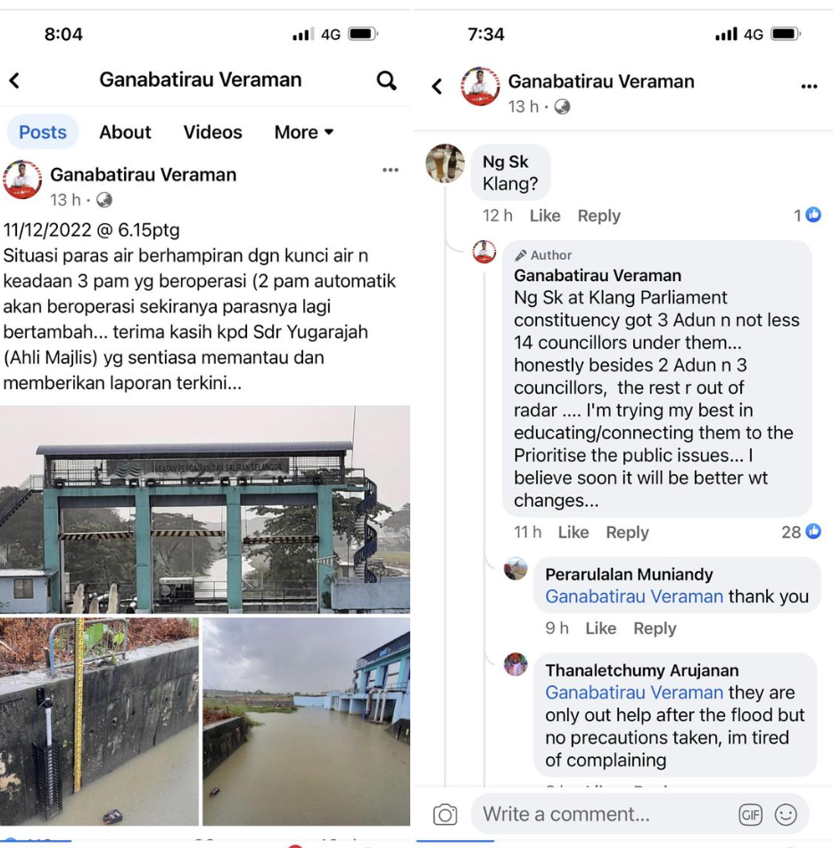 甘纳巴迪劳昨日在脸书上载贴文:指巴生河水位已达关键水平,3个水泵已投入运作(若水位继续上涨两个水泵将自动运作),并感谢市议员尤加拉惹时常监督及汇报最新的情况。