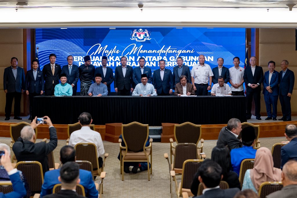 希盟和国阵等5大政党联盟今日签署联合组建团结政府协议,承诺将确保首相安华领导的联合政府做满5年,以共识执政。