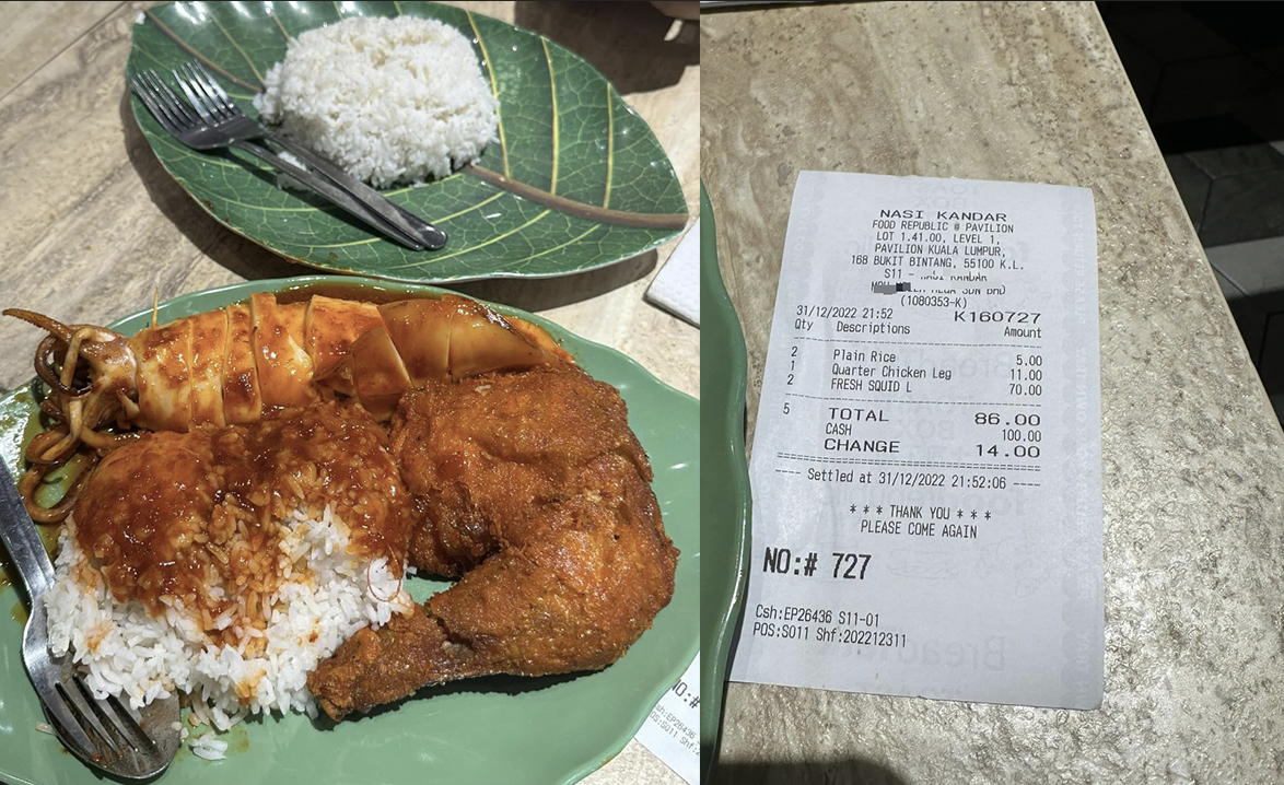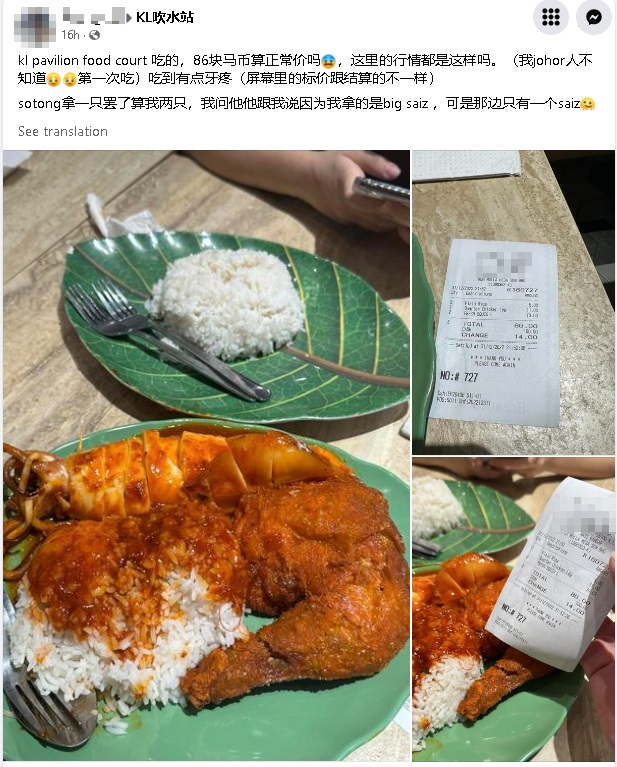 一位来自柔佛的网民,在社媒上分享他在岁末12月31日晚在吉隆坡柏威年(Pavilion)广场美食广场用餐的经历,说自己来自柔佛,不确定这价格的扁担饭是否“正常”,但直言自己吃得很牙疼。