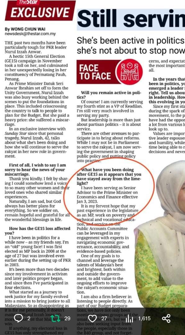 努鲁依莎早前接受《星报》专访时说,她在月初受委为首相经济金融高级顾问,她即便无缘继续担任国会议员,但她仍是公正党副主席,仍会在政治上保持活跃。