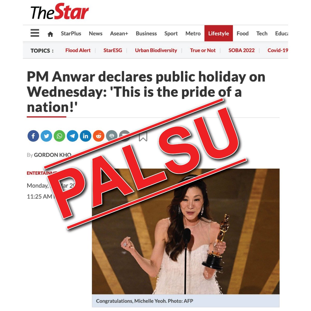 社媒在傍晚出现一个以《星报》新闻网页为模板的截图,内容是宣称“首相安华宣布周三公共假期,这是国家的骄傲”。内容还配上杨紫琼得奖的新闻照。