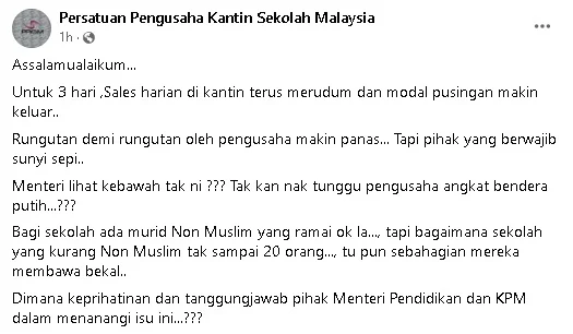 PKSM在脸书专页分享部分食堂业者心声,见到不少在斋戒月期间营业的业者,都面对业绩不佳情况,甚至入不敷出。