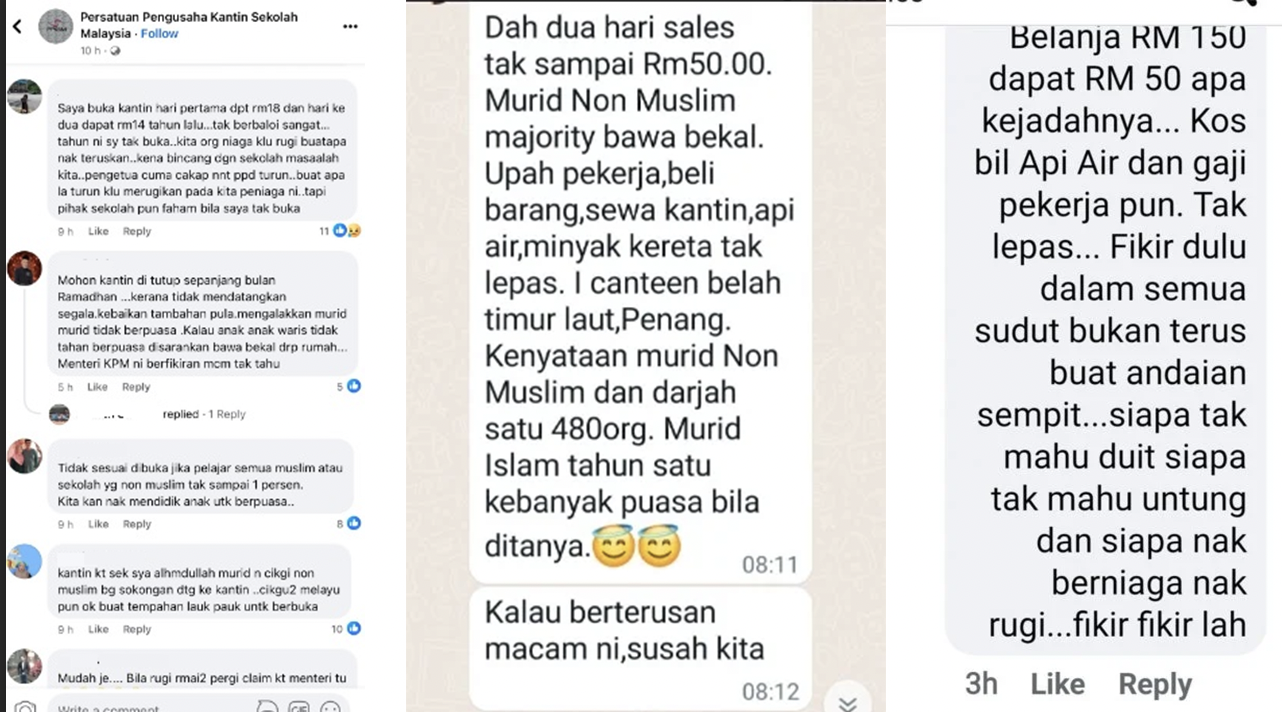 教育部长法丽娜日前指示所有学校食堂斋戒月期间须营业,除了被伊党批评外,如今也引来部分食堂业者不满,有业者大吐苦水,表示营业额惨淡,亏食材还亏成本!