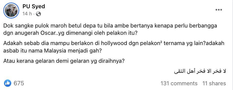 他在第二个贴文写:“没想到,我说那个演员拿奥斯卡奖有什么值得骄傲的这么让人生气?是因为她能跟其他著名的好莱坞演员一起演戏吗?这是令马来西亚受欢迎的原因吗?抑或是她赢得了一个又一个的奖项?”