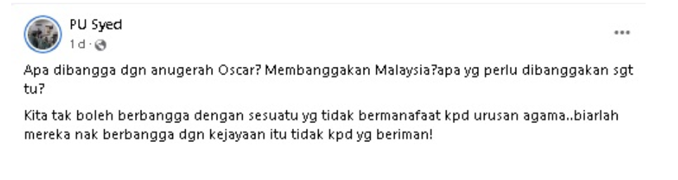 大马国际巨星杨紫琼荣膺第95届奥斯卡影后,成为史上第一位的亚裔奥斯卡影后,大马民众无不为她高兴及引以为傲,但伊斯兰宗教师PU Syed却这样说::“这有什么好骄傲的”?