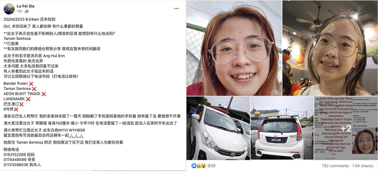 根据洪卉恩表姐今早在社媒的更新,指表妹截至今早8时依然没能寻获,同时也有不少热心网民也把其po文翻译成马来文转发到马来群组去,希望发动更多力量找人。