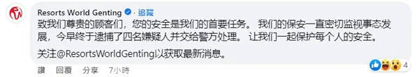 与此同时,云顶世界也在该帖子留言区回应,指警方已逮捕4名嫌犯助查,并指该公司将极力保护顾客安全。