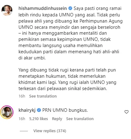 希山慕丁的贴文也获得遭开除的前总秘书安努亚慕沙留言,直批巫统党领袖态度嚣张,并获得逾千个点赞。