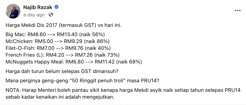 前首相纳吉虽然人在服刑,但他对国内物价及通胀课题极度关心,其官方脸书就以“国民快餐”麦当劳为范例,挑出麦当劳在过去6年里,价格涨了很多!