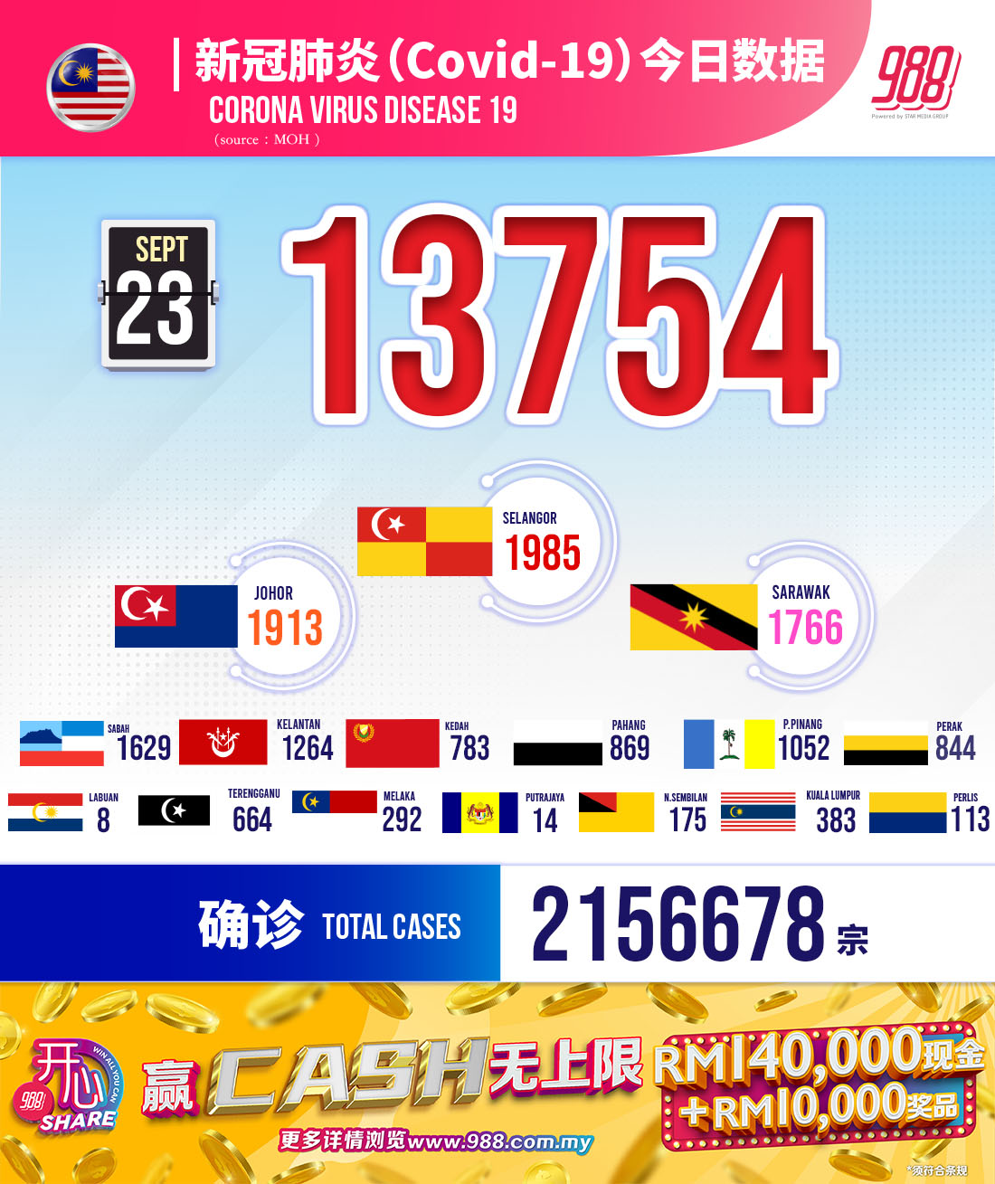 卫生部通报,截至23日12pm,我国新增 #13,754例,累计病例至今 # 2,156,678 宗。