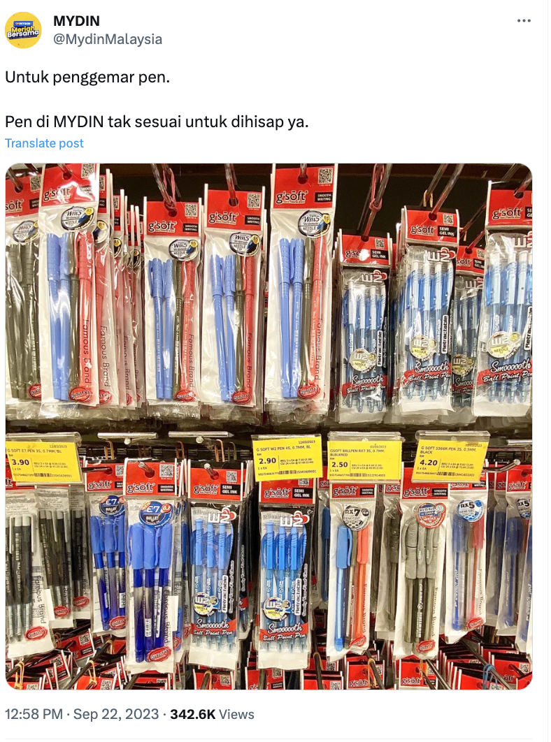 MYDIN社媒真的是紧贴时事,在“烟还是笔”事件发酵后,迈丁社媒团队再次发挥幽默本色,在社媒X图文并茂地的温馨提示“MYDIN的笔不适合吸哦!”,来调侃莫哈末依克玛宣称自己在议会厅内含著的是笔,而不是电子烟。