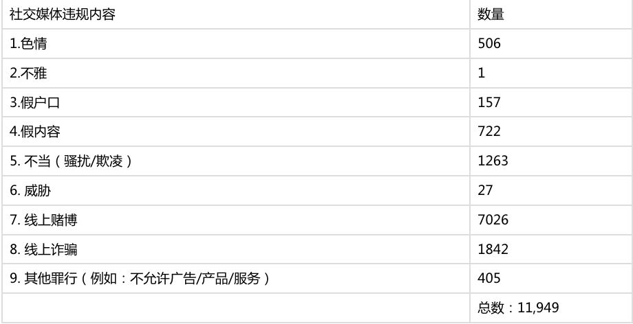 “其他包括:线上诈骗(1842条)、骚扰或霸凌(1263条)及虚假内容(722条)。”
