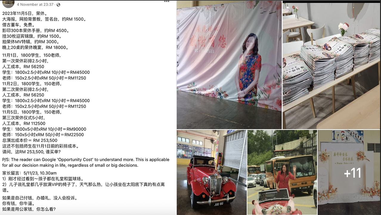 该家长较后在脸书发文估算这场荣休仪式各项花费,称耗资27万令吉,并估算师生参与到这场仪式彩排的“人工成本”,借此抨击校方挥霍引发热议。