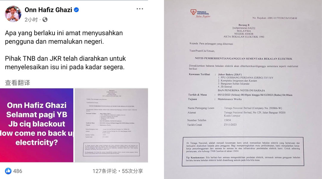 根据翁哈菲兹贴文所上载图片可见,国能在11月27日发出通知指,包括移民局大厦、苏丹依斯干达大厦(CIQ)、新山中央车站、及电能处理部件(PPU Gerbang Perdana),在12月5日晚8时至12月6日早4时,电供会受到短暂影响。