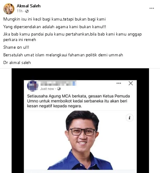 他在脸书转发张盛闻劝停的新闻截图,并表示:“这件事对你来说可能是小事,但对我们来说不是;被嘲弄的是我们的宗教,不是你们的!”