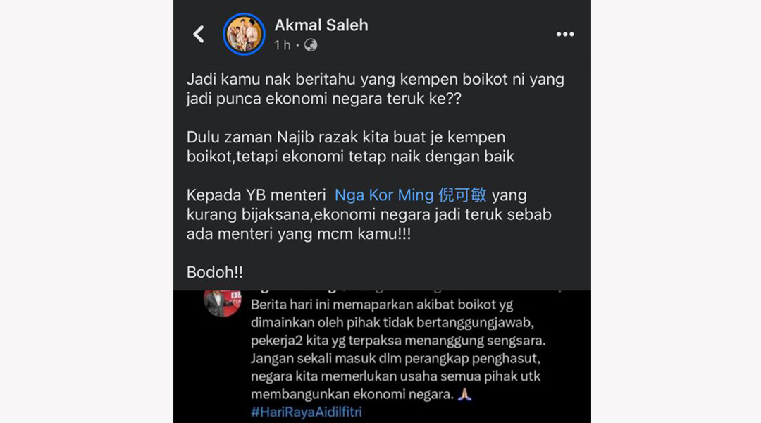 阿克马指出,前首相纳吉掌政期间,巫青团也发动杯葛但经济依然很好,并呛声倪可敏:“致不聪明的倪可敏部长,因为有你这样的部长,国家经济才会如此糟糕!愚蠢!”