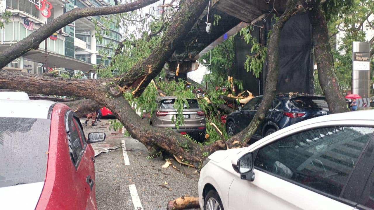 一场狂风暴雨袭击隆市中心,苏丹依斯迈路介于凯煌酒店与香格里拉酒店前路段,一棵大树倒下导致17辆轿车被砸中,酿1死1伤悲剧!