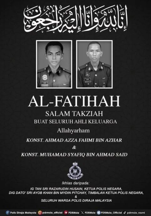 另一方面,拉沙鲁丁说,不幸殉职的2名警员阿末阿沙法米和莫哈末沙菲克都很年轻,皆为22岁,还单身。