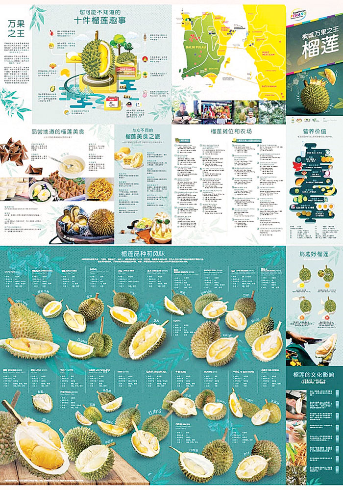他说,目前槟州政府的旅游手册,在积极推广槟城榴梿,不管是酒店、一些旅游景点如博物馆,都随时随地地为游客介绍本地榴梿,提供大家更多的资讯与方便。他相信这样的推广,不只是会带动国外的游客,也能促进国内旅游效应。