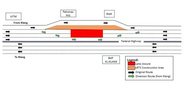 配合第三轻快铁(LRT3/莎阿南干线)工程,从本月5日至20日期间,联邦大道前国油及蚬壳油站(吉隆坡及巴生方向)车道会分阶段关闭及改道。