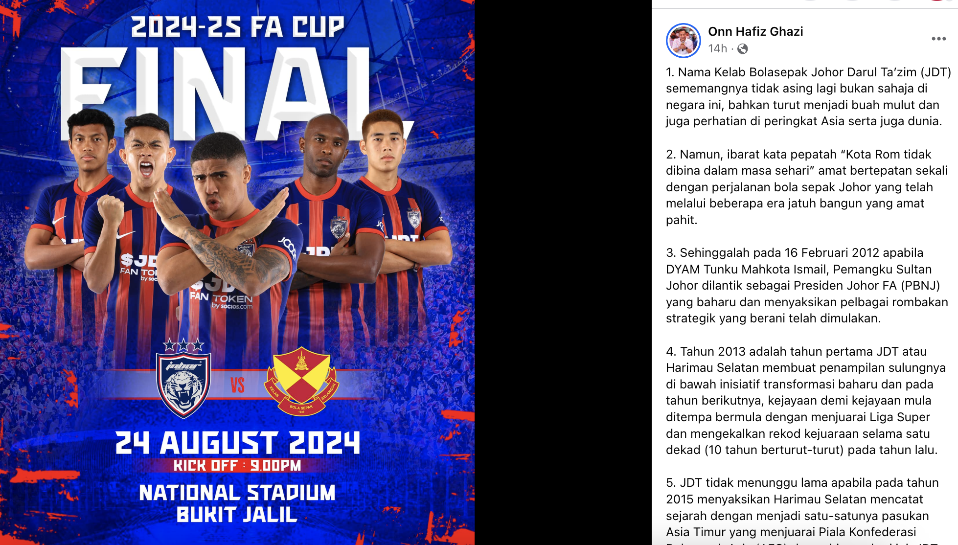 他呼吁柔佛人民于本周六齐聚吉隆坡武吉加里尔国家体育场,为JDT加油助威,以红蓝色旗海填满整个体育场,为球队加油,成功捍卫胜利。