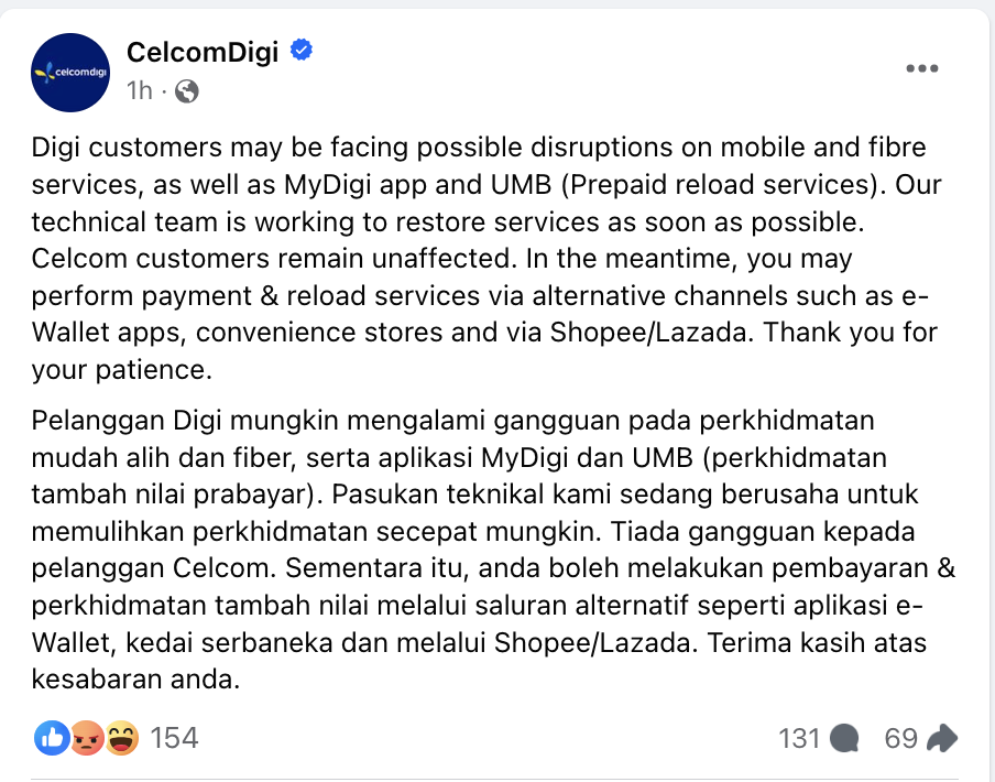 “Digi客户可能会面临手机和光纤服务,以及 MyDigi 应用程序和 UMB(预付费充值服务)可能出现的中断。我们的技术团队正在努力尽快恢复服务。 Celcom 客户不受影响。”