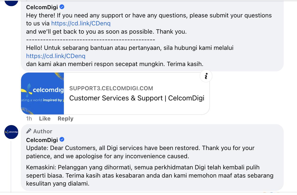 CelcomDigi较后在官方脸书发文回应,指技术团队正努力尽快恢复服务,此干扰只是Digi,Celcom用户不受影响。
